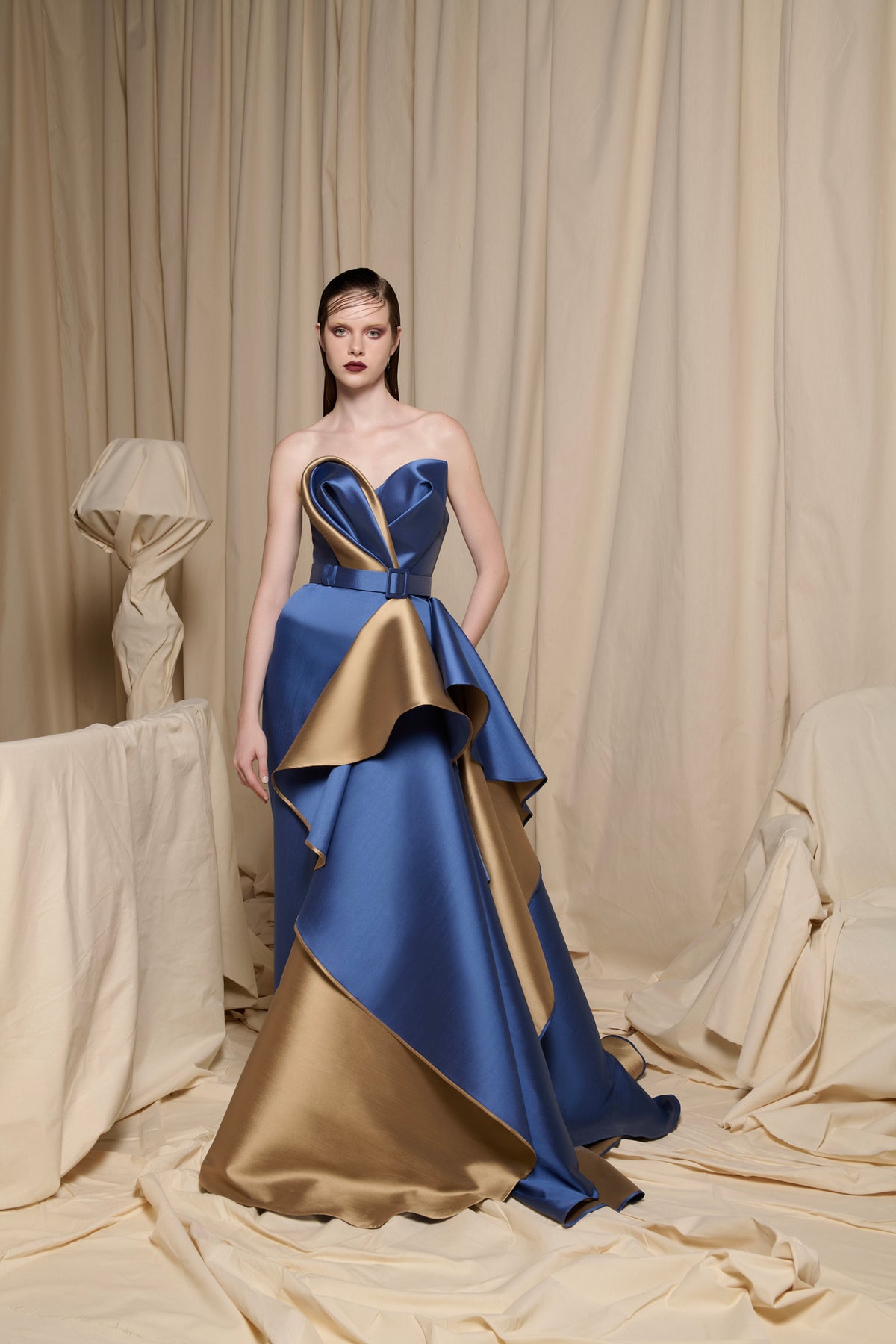 A strapless ball gown in sapphire blue and antique gold satin. The sculpted bodice folds into a petal-like shape edged with gold, while the belted waist anchors an asymmetrical overskirt that reveals the contrasting lining with every step. A front slit adds a modern touch to the dramatic volume of the train.