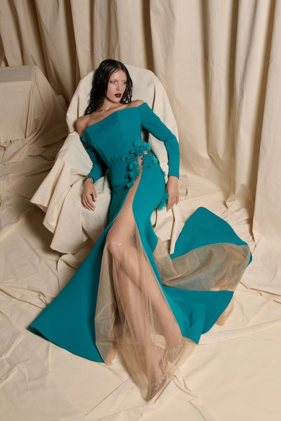 An off-the-shoulder teal gown cut from smooth crepe with a dramatic nude tulle slit. Hand-crafted 3D flowers trail along the opening, revealing glimpses of skin beneath. A fitted bodice with a slim belt shapes the waist before falling into a fluid train.