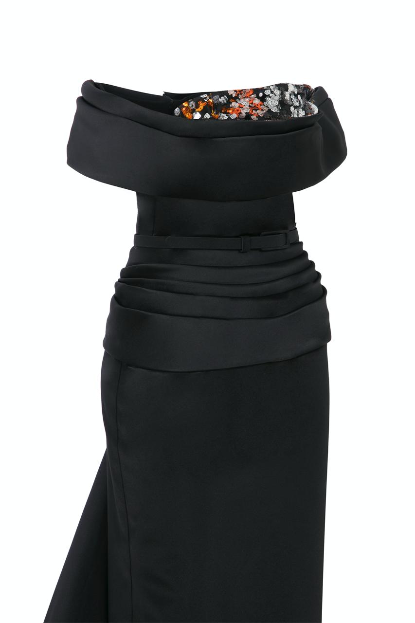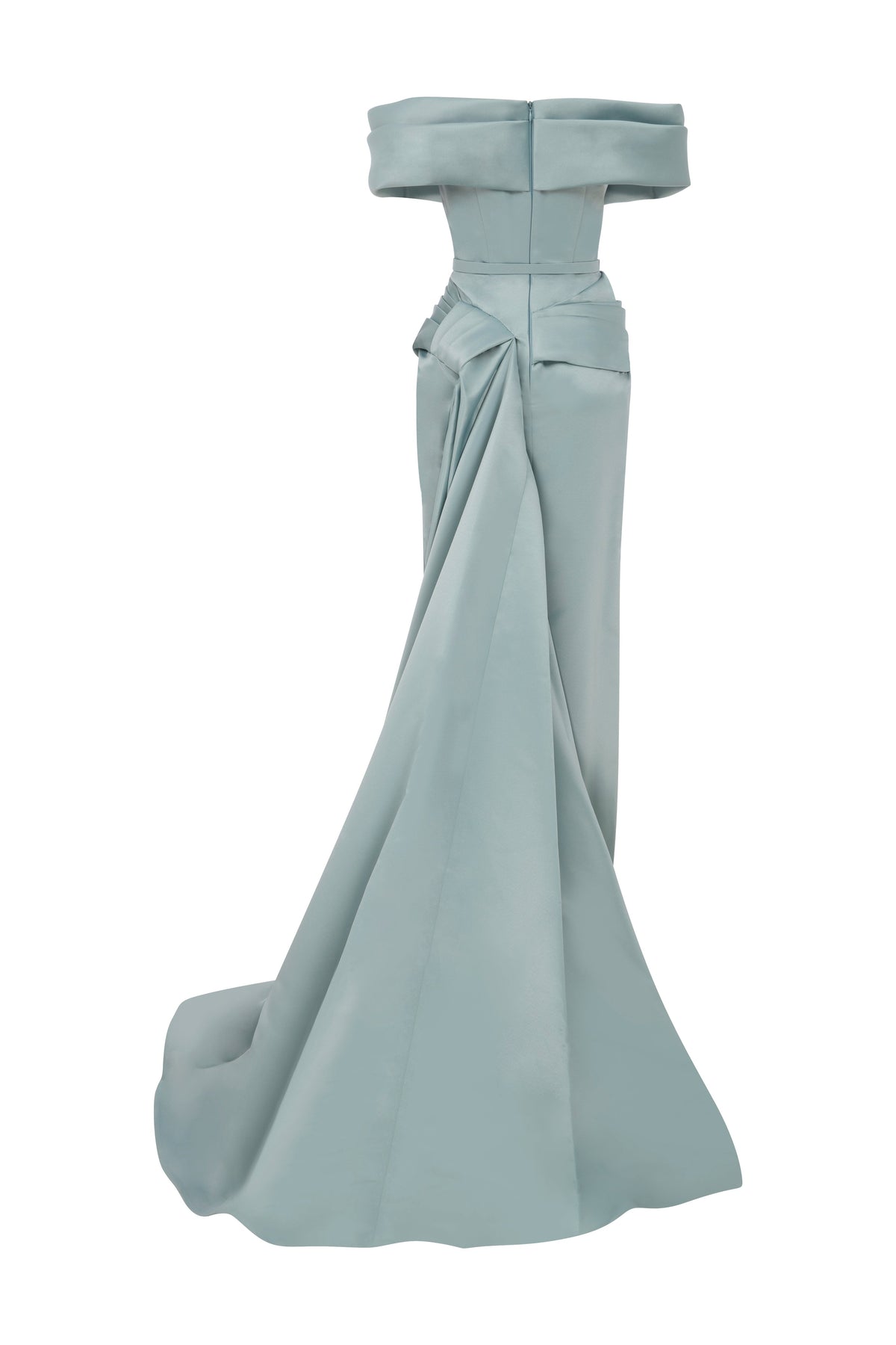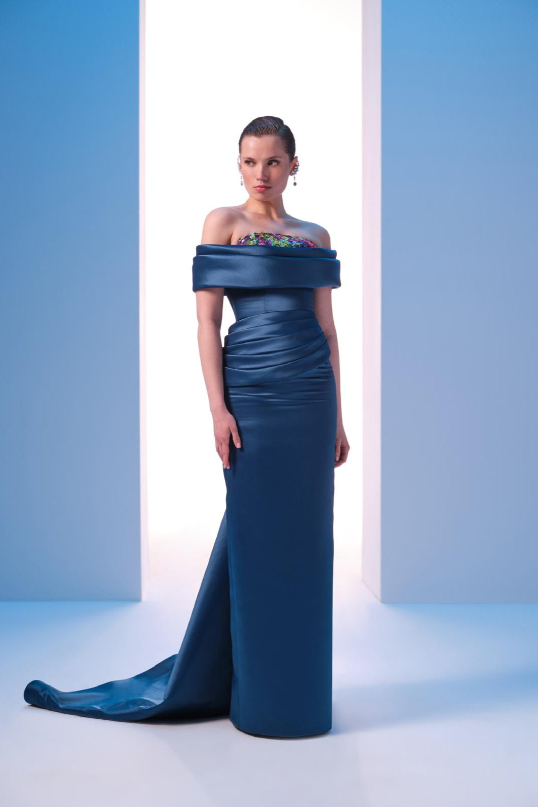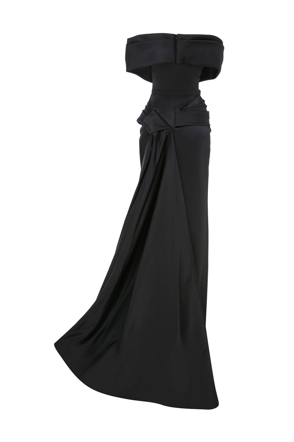With off-shouldered short sleeves connected to the drapes on the bust