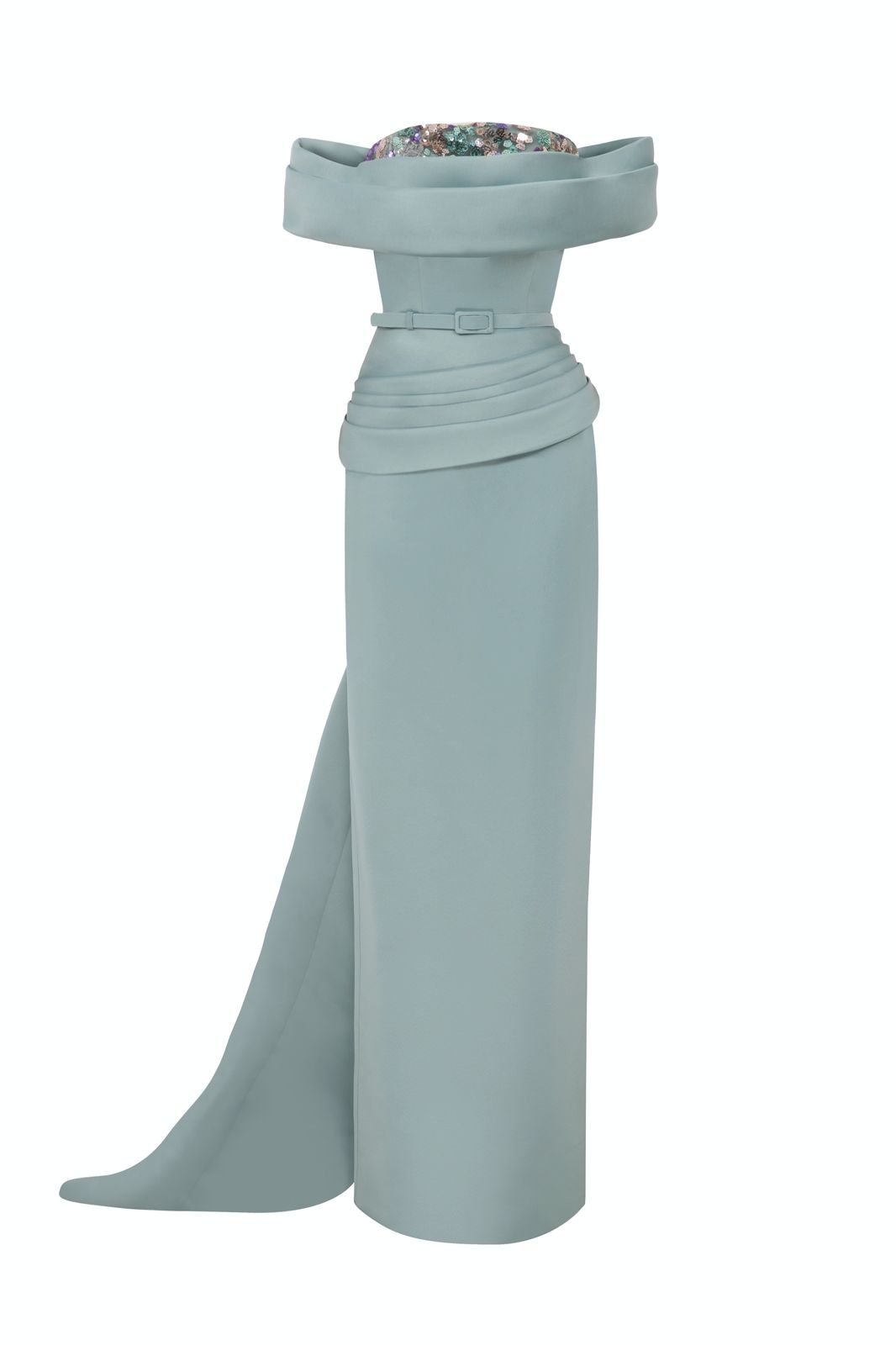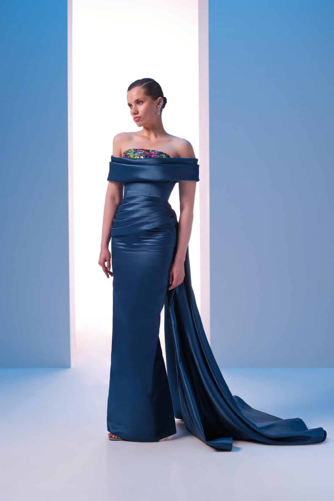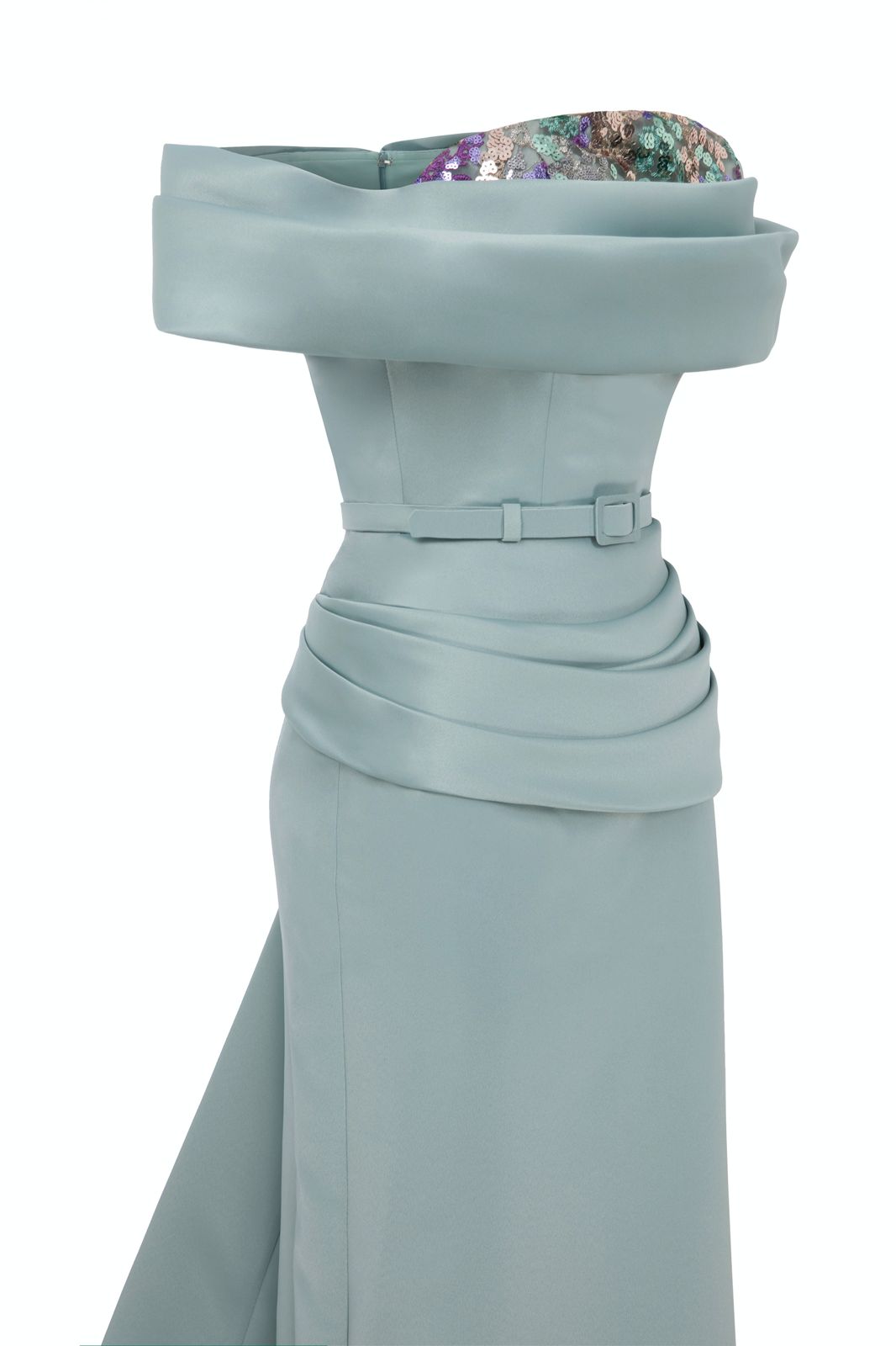 With off-shouldered short sleeves connected to the drapes on the bust