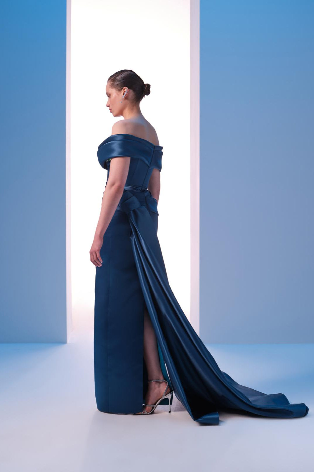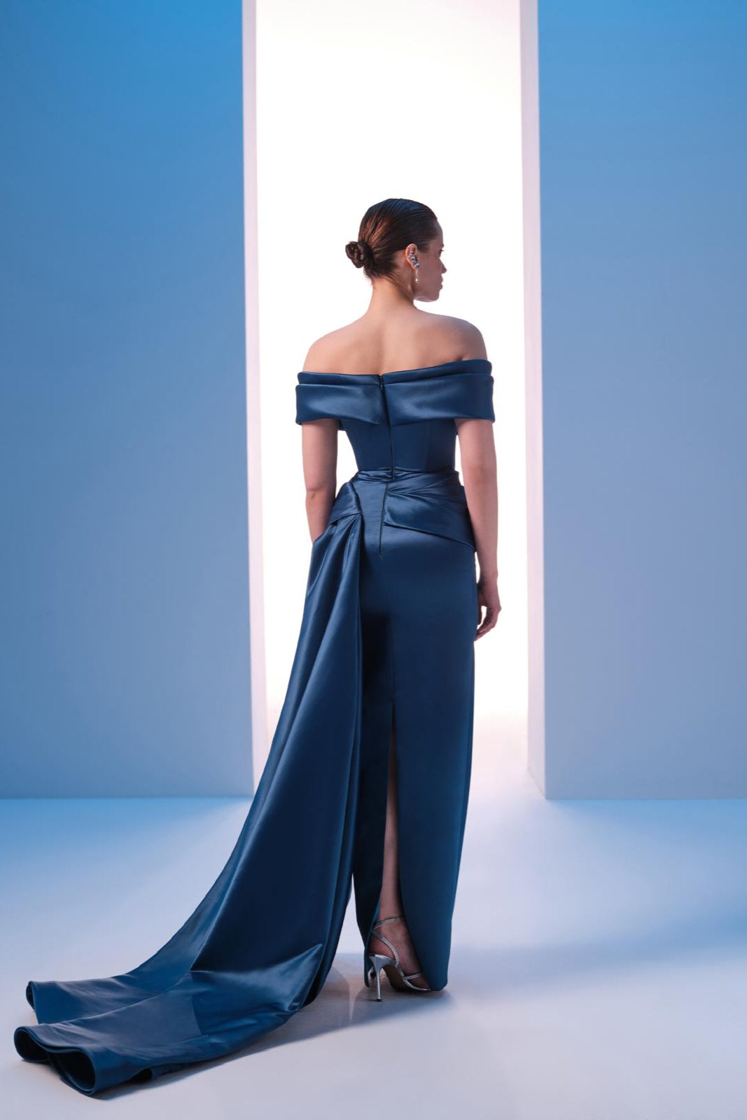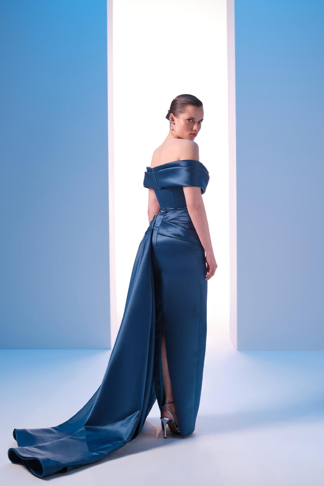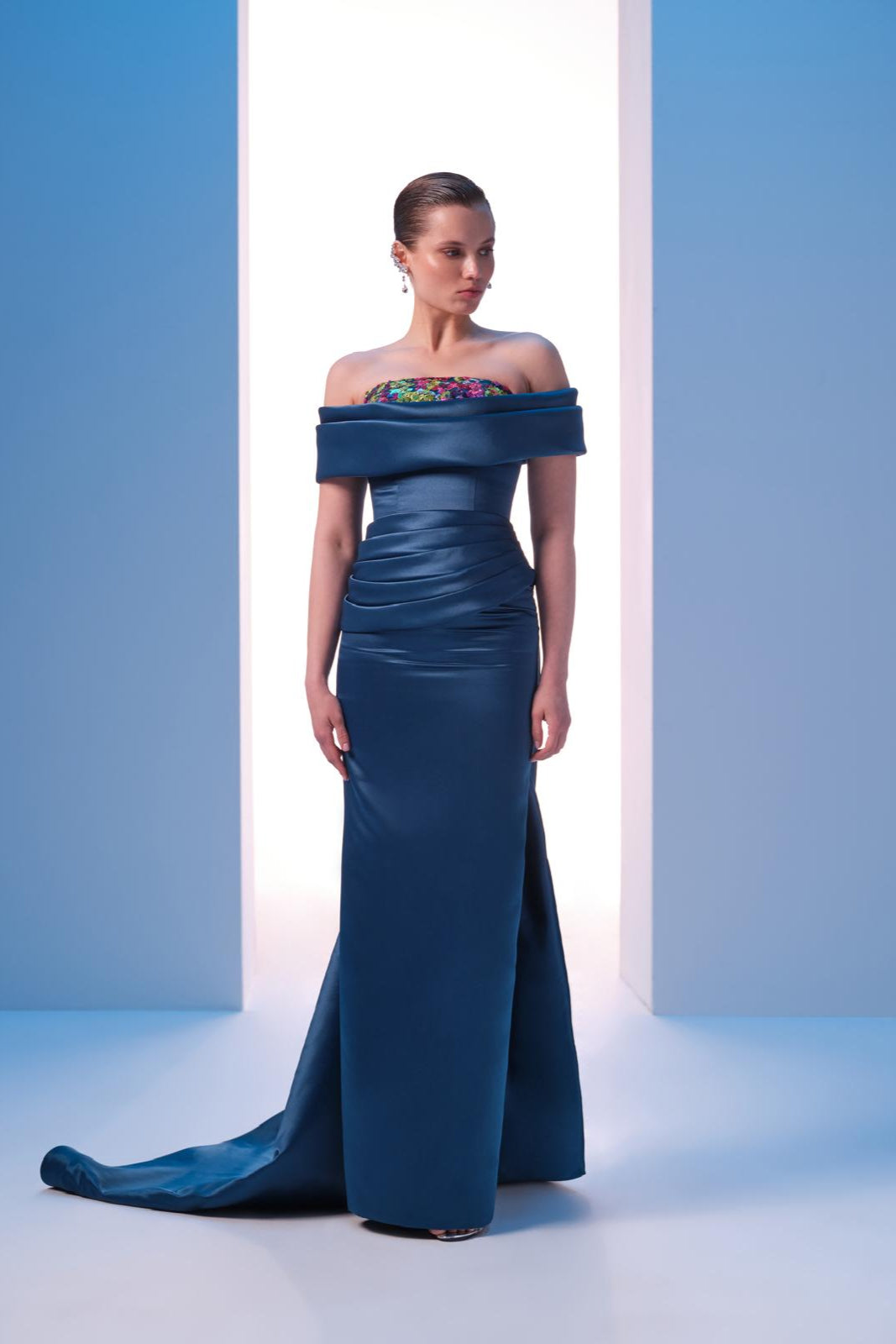 With off-shouldered short sleeves connected to the drapes on the bust