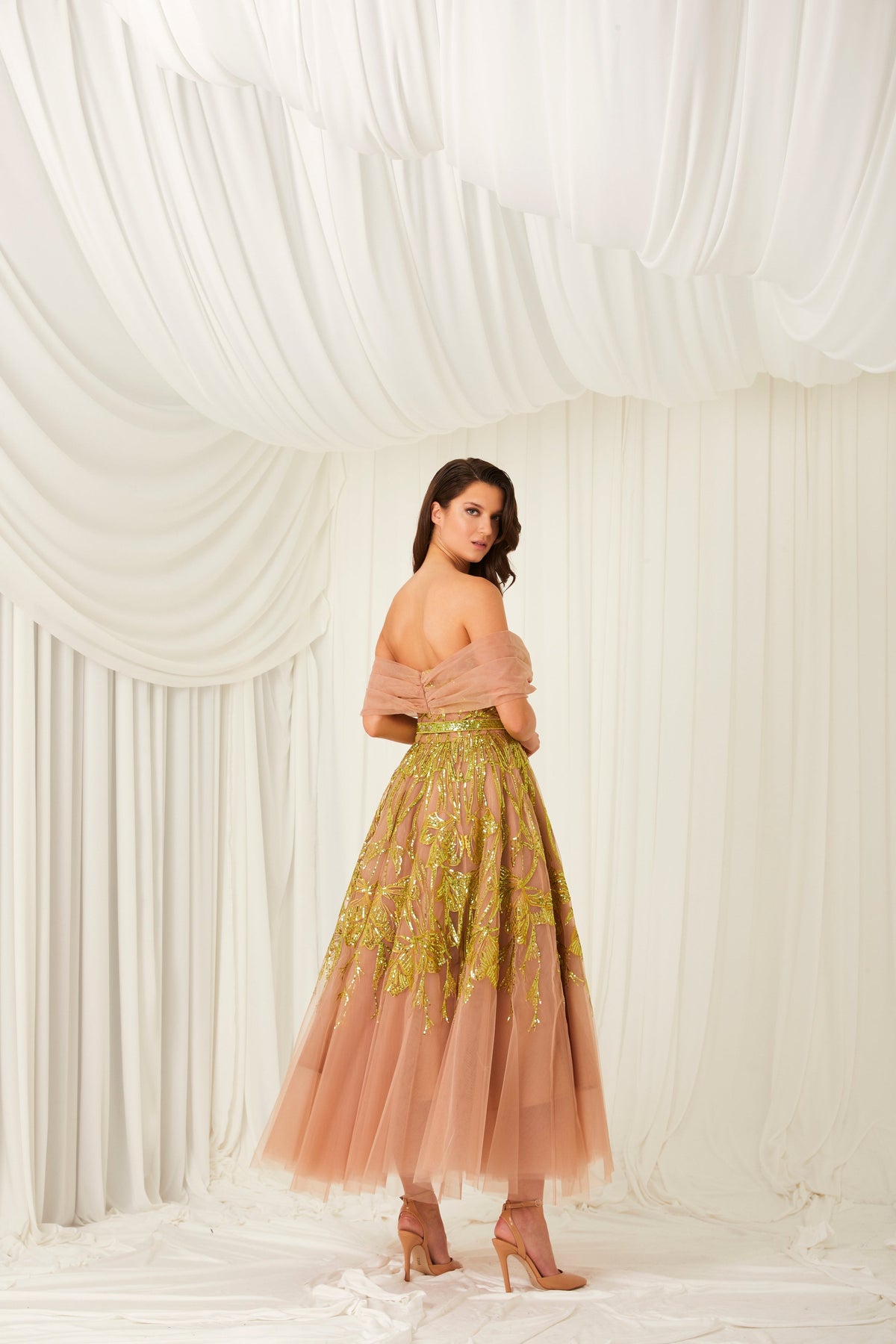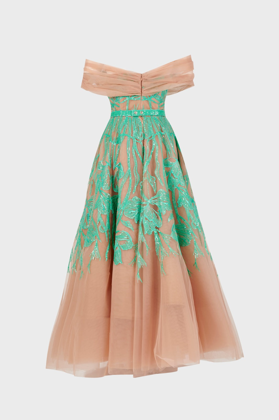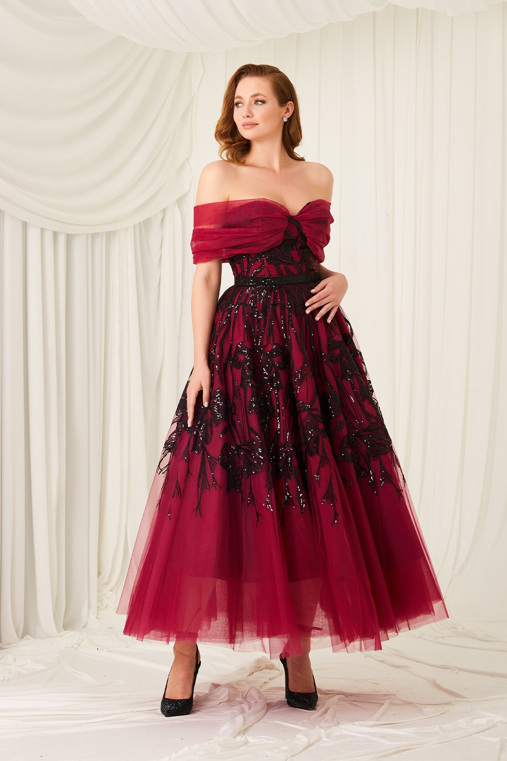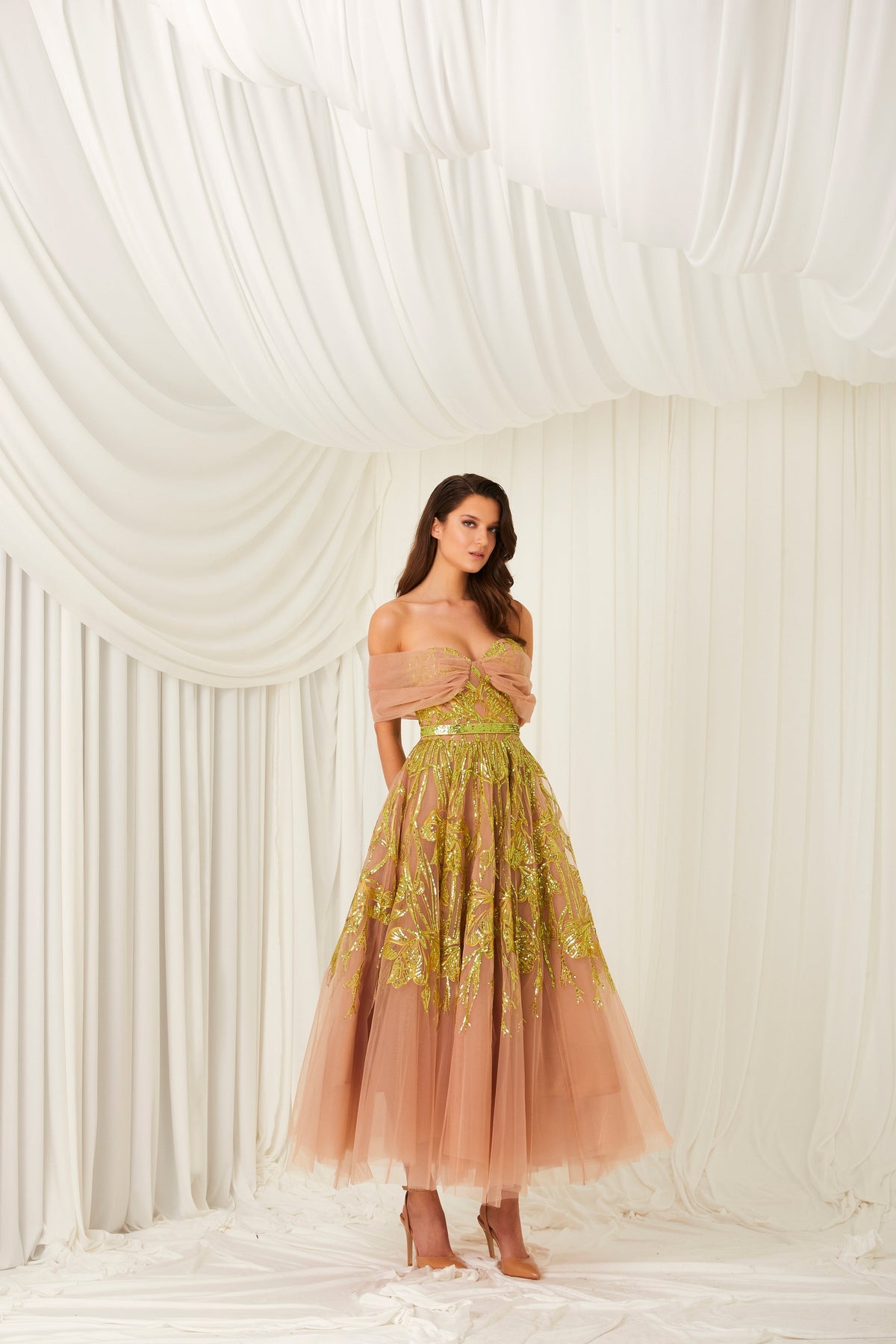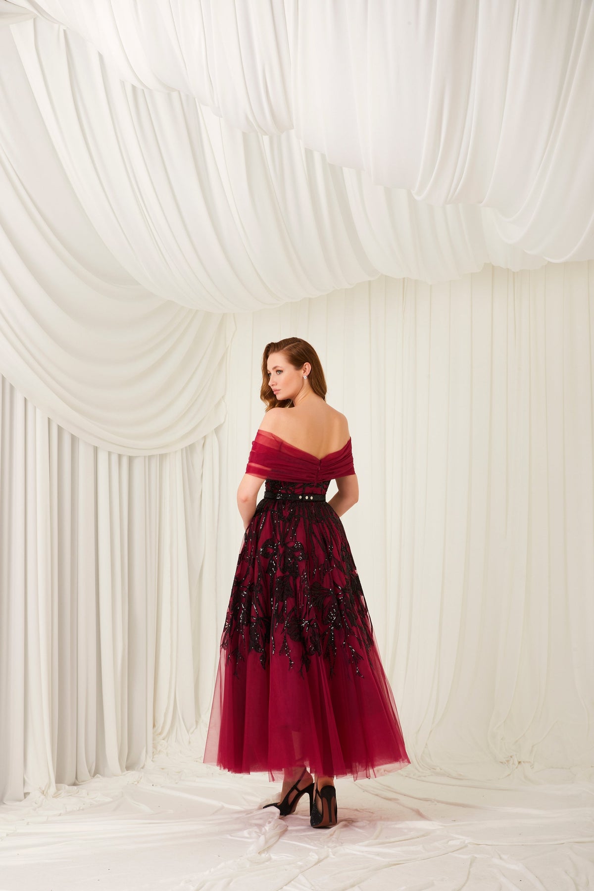 • Off-shoulder hand-made sequence embroidered dress with a shoulder to shoulder french Tul Bust, Midi-length skirt, and an elegant thin french crep belt