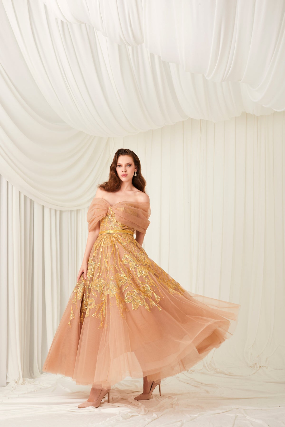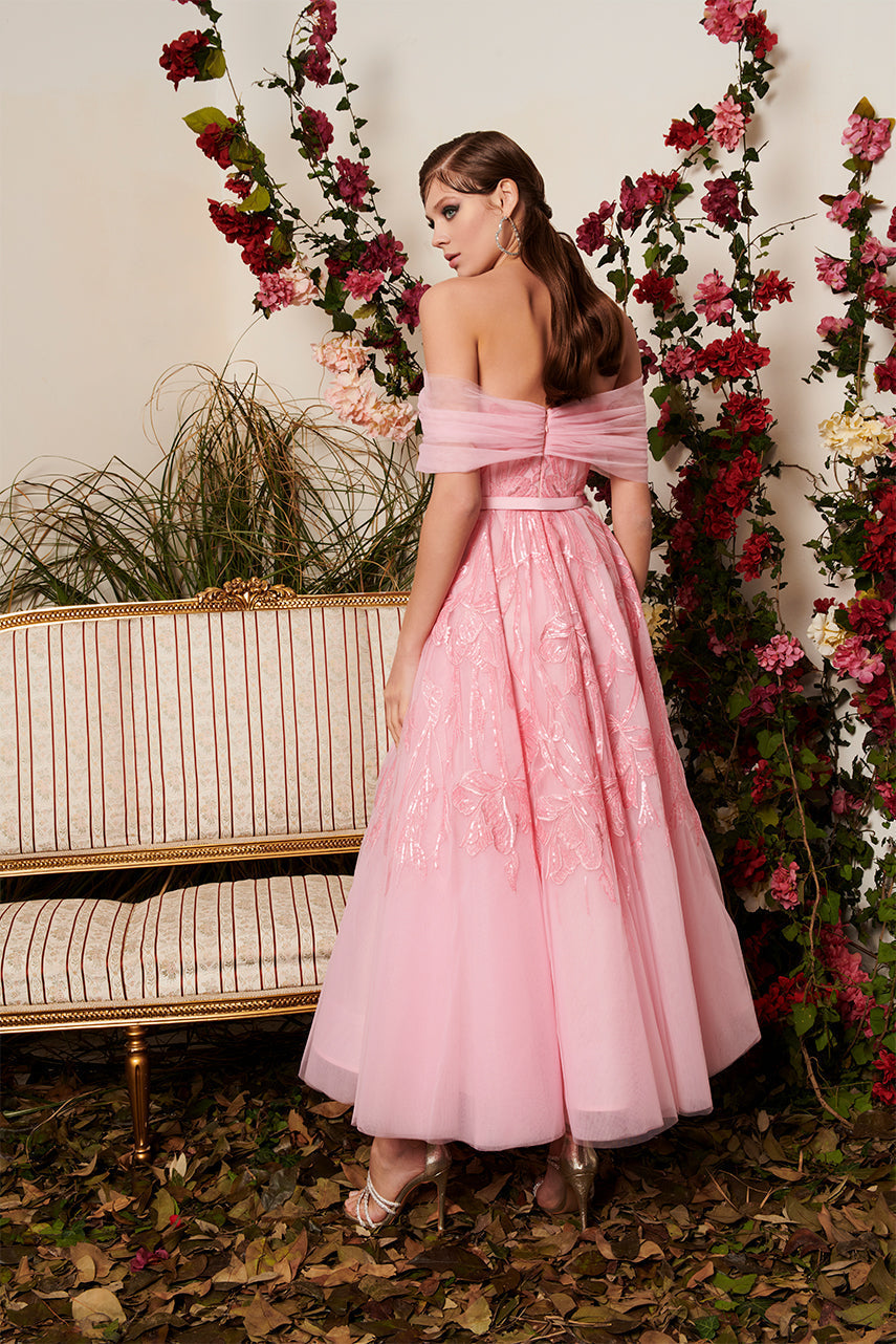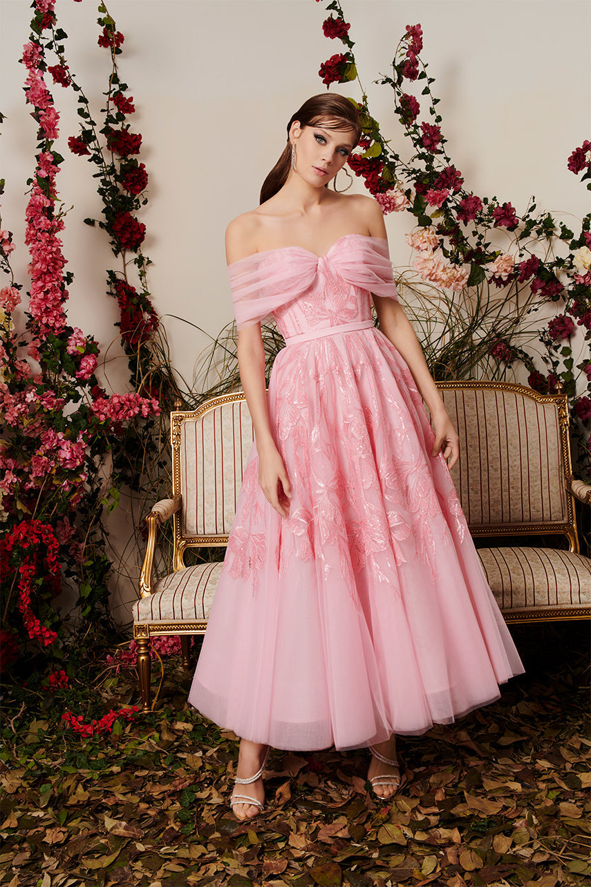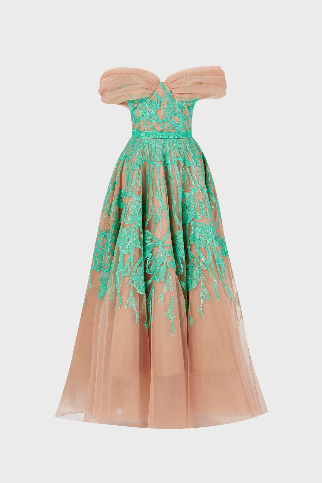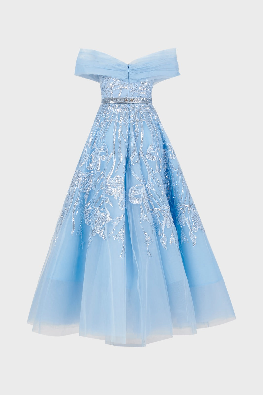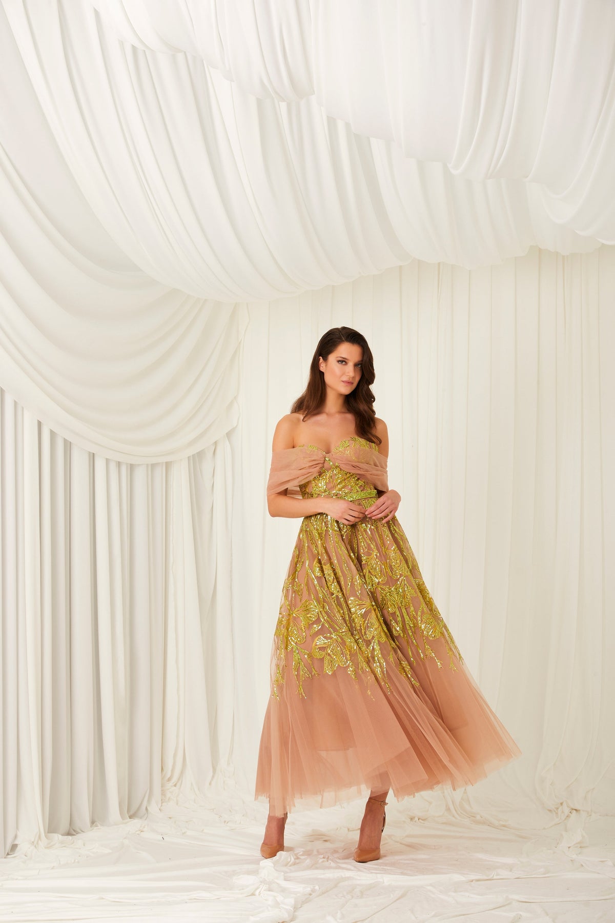 • Off-shoulder hand-made sequence embroidered dress with a shoulder to shoulder french Tul Bust, Midi-length skirt, and an elegant thin french crep belt