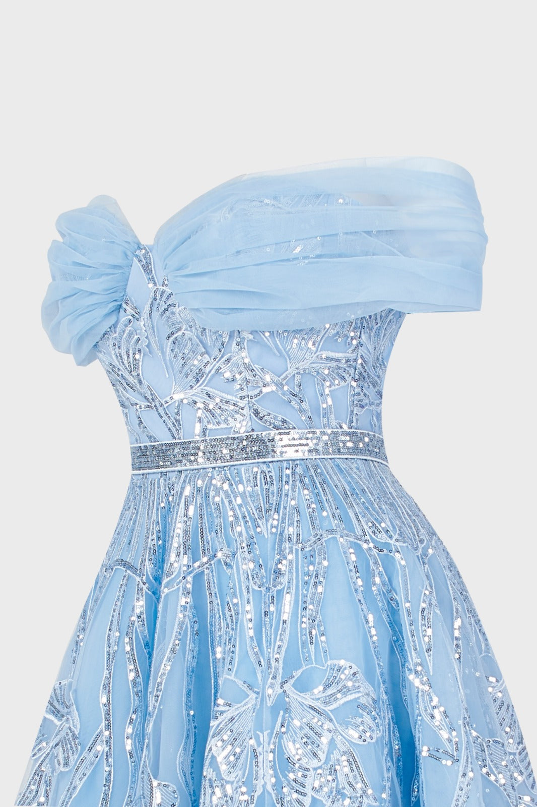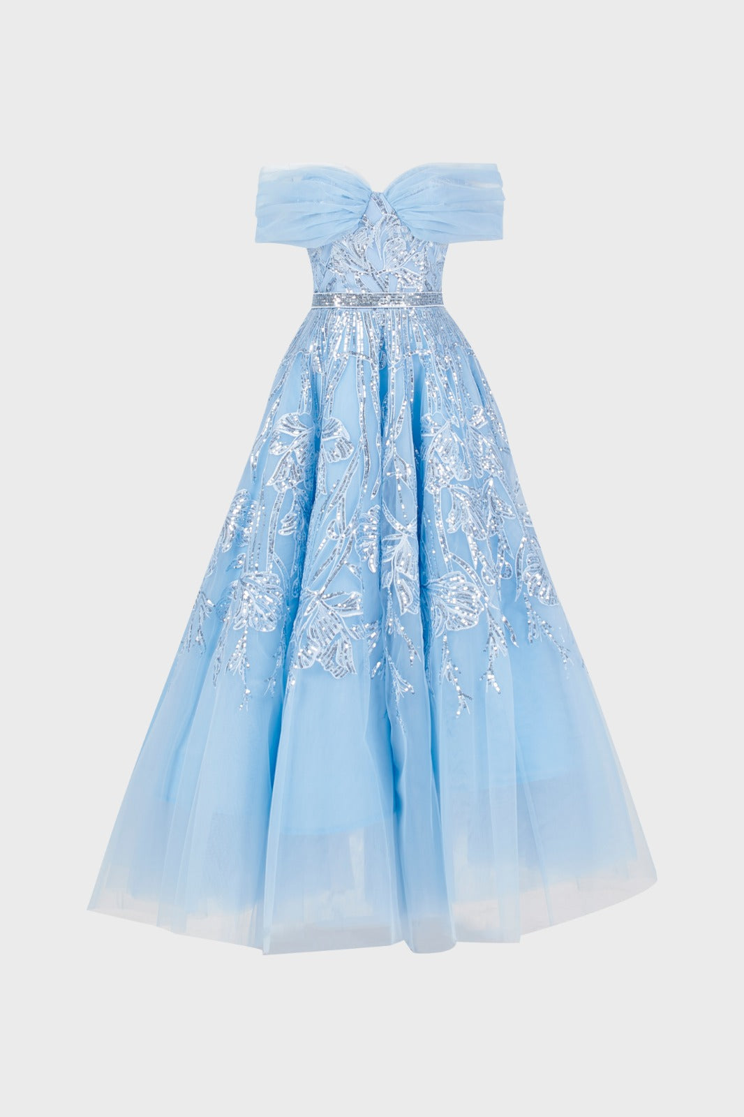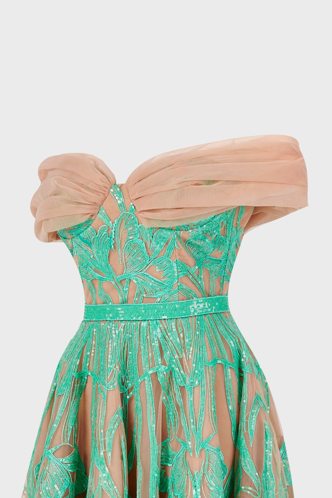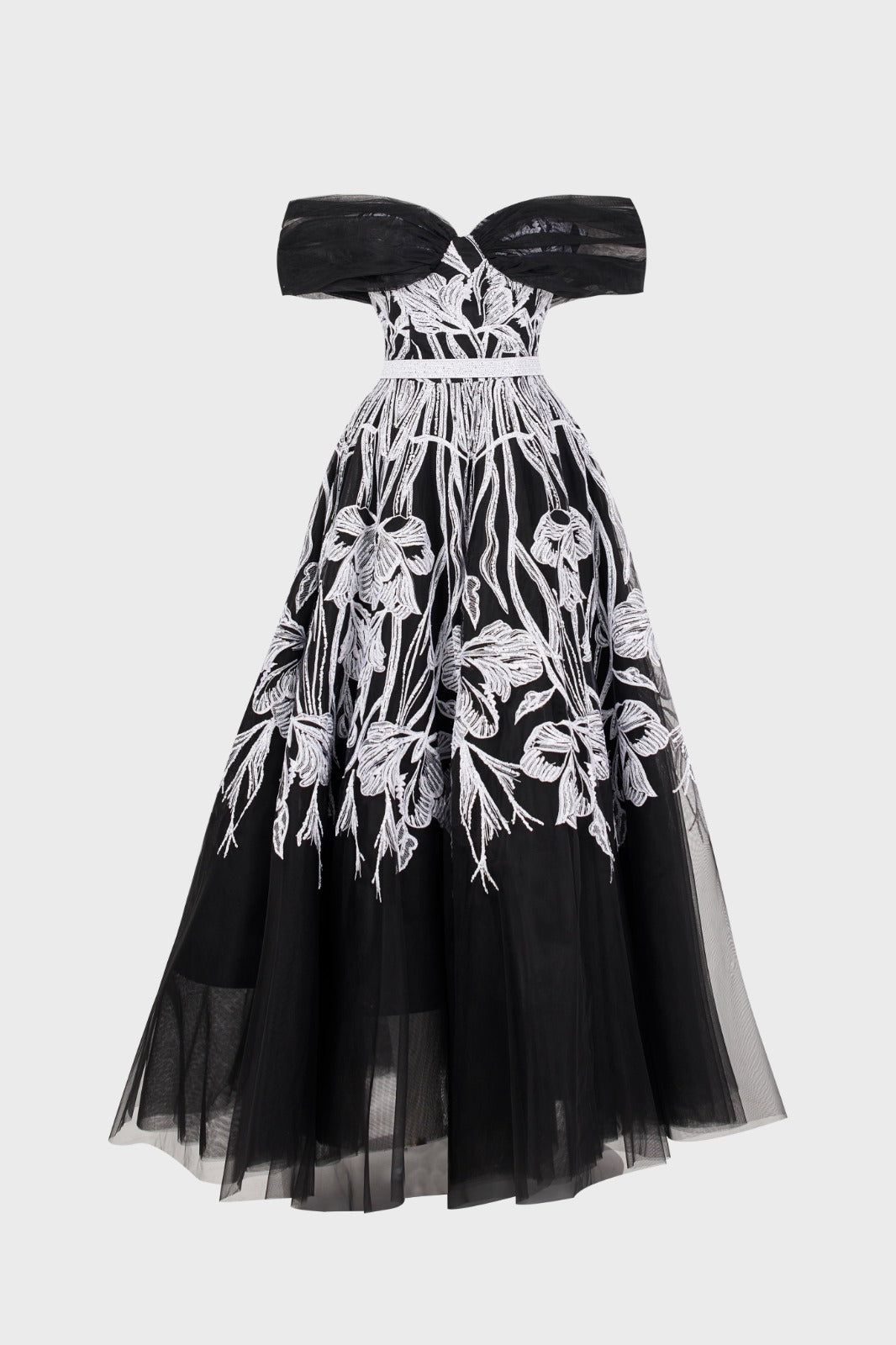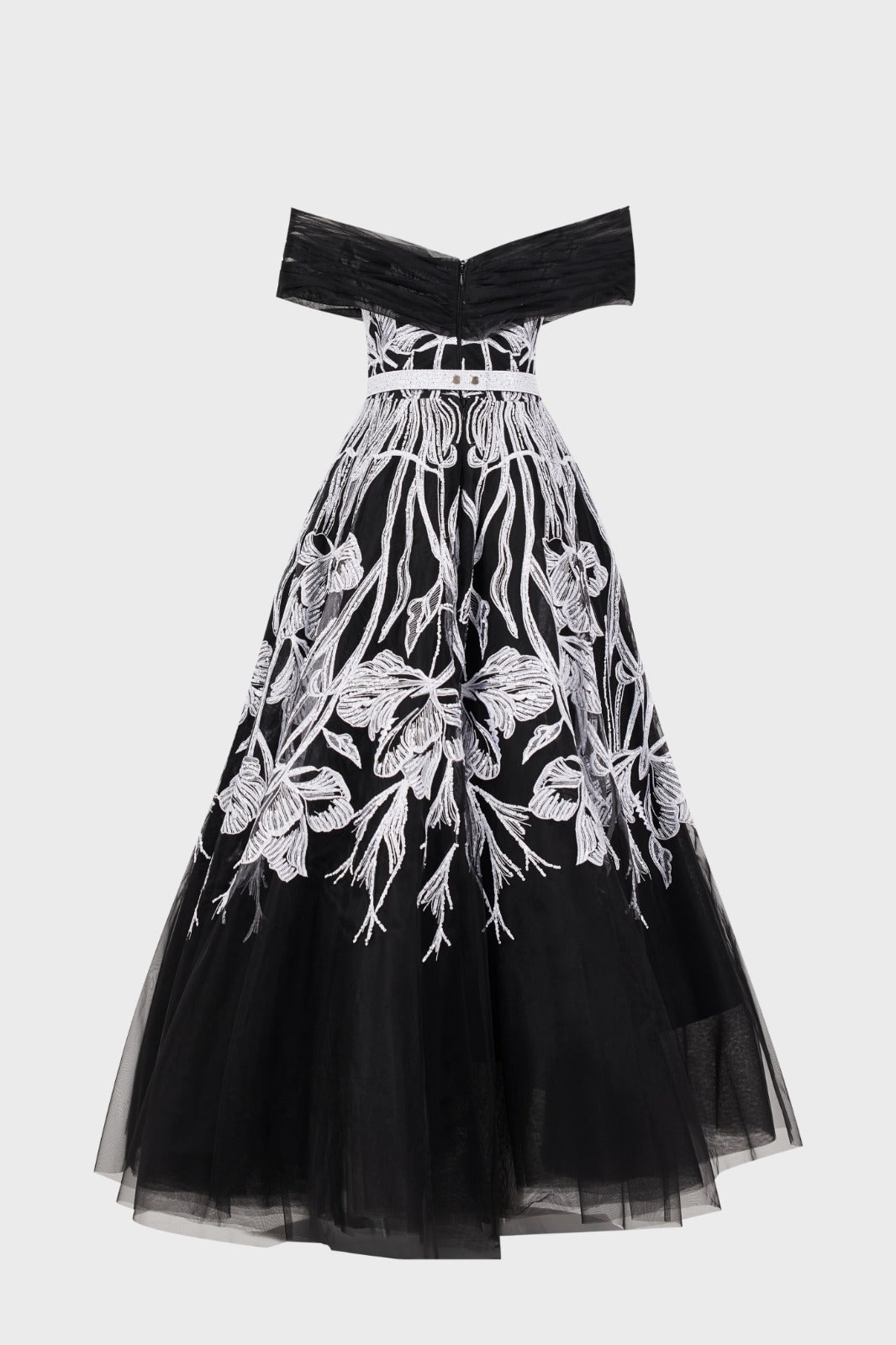 • Off-shoulder hand-made sequence embroidered dress with a shoulder to shoulder french Tul Bust, Midi-length skirt, and an elegant thin french crep belt