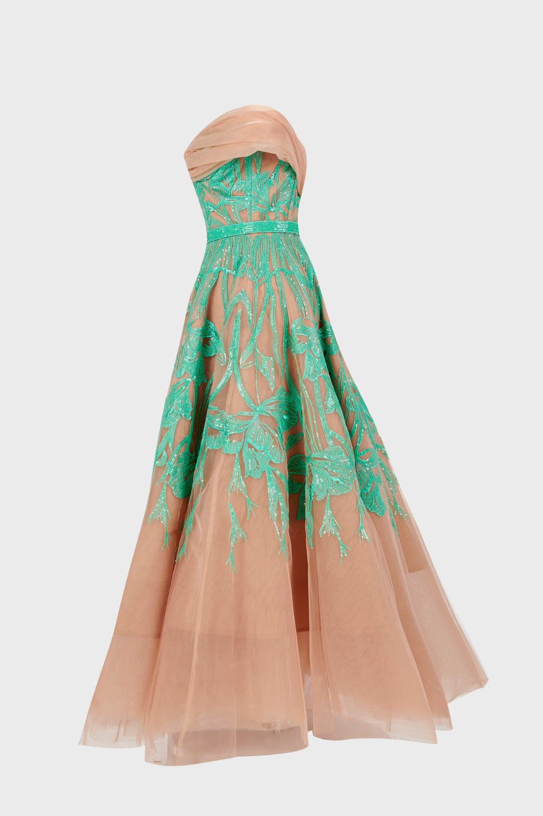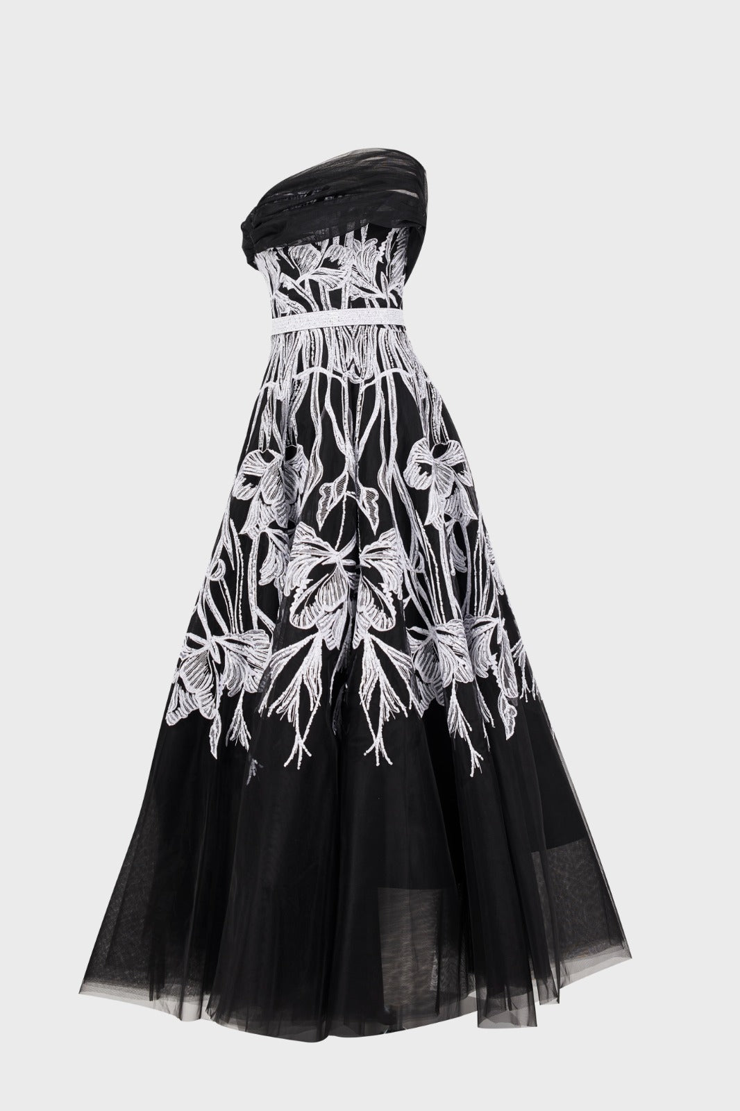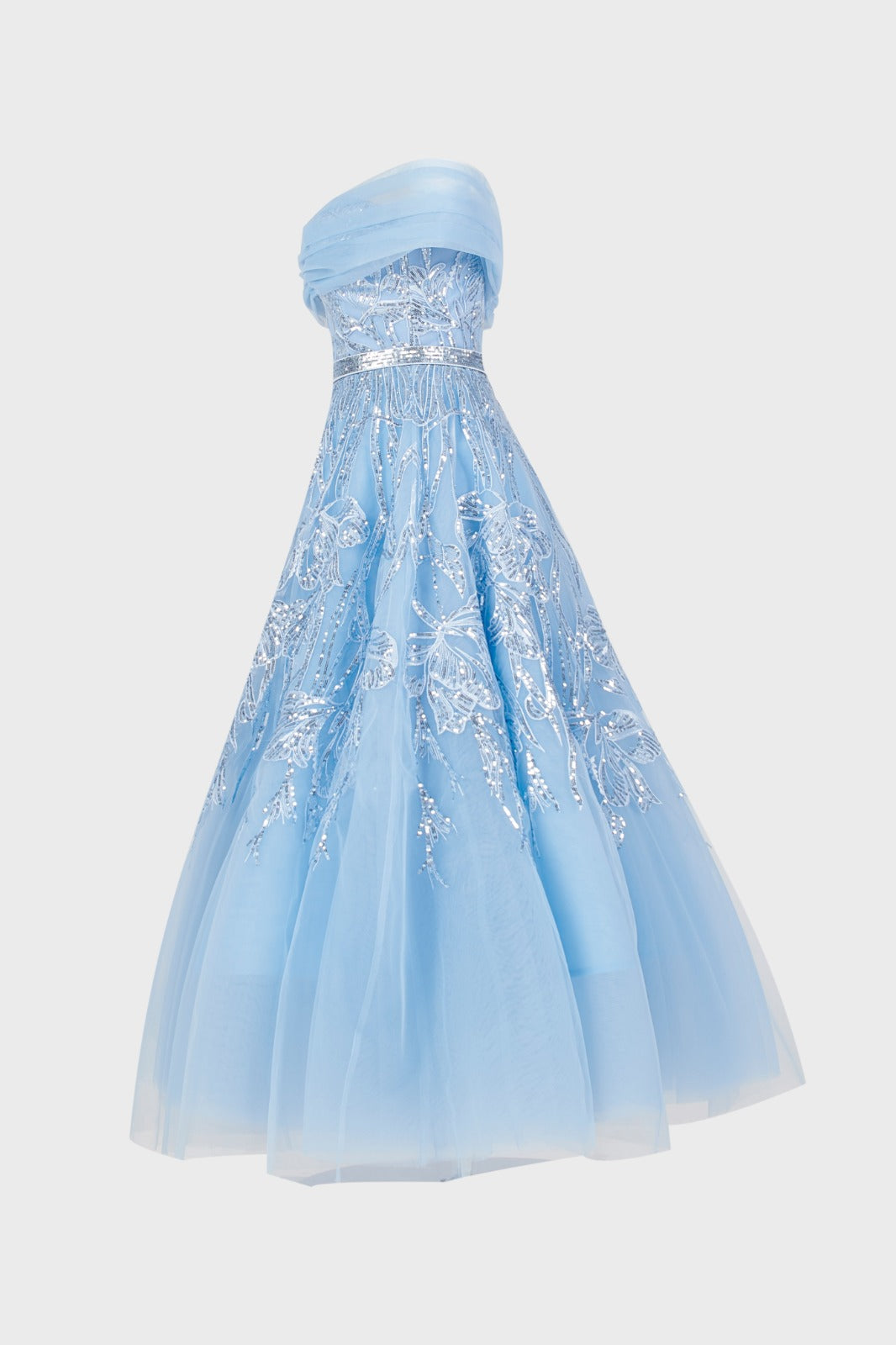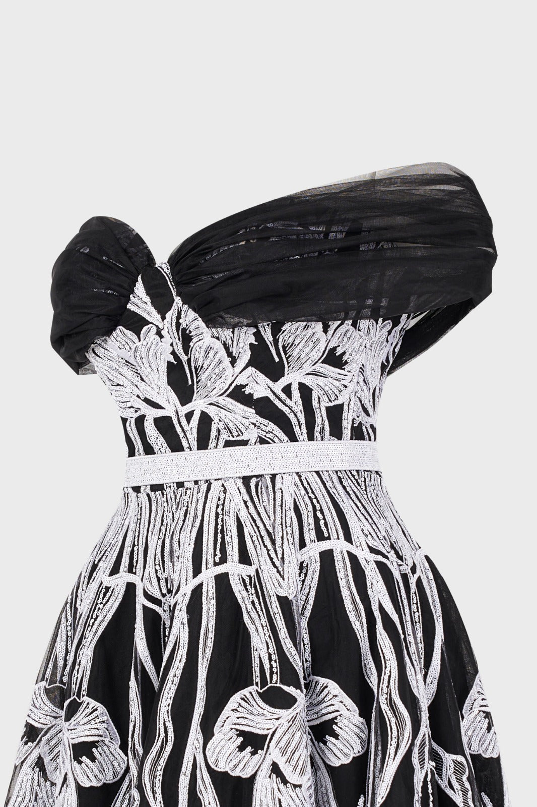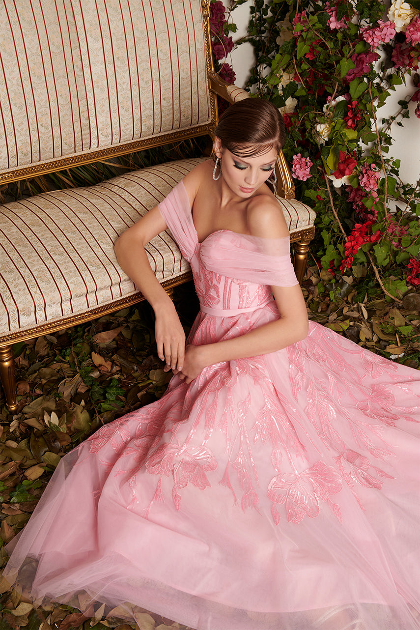 • Off-shoulder hand-made sequence embroidered dress with a shoulder to shoulder french Tul Bust, Midi-length skirt, and an elegant thin french crep belt