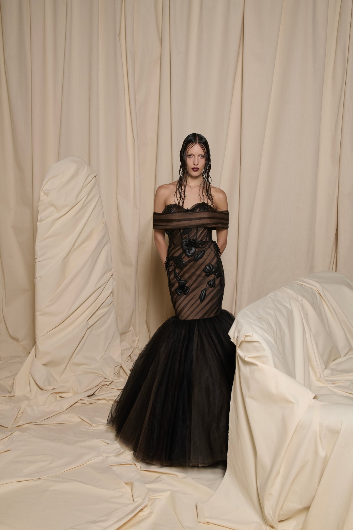 A sculpted off-shoulder mermaid gown in sheer black tulle and silk organza. Striped layers reveal and conceal the body beneath, while hand-appliquéd black florals climb across the torso. The skirt erupts into a dramatic, layered tulle fishtail that moves like a shadow.